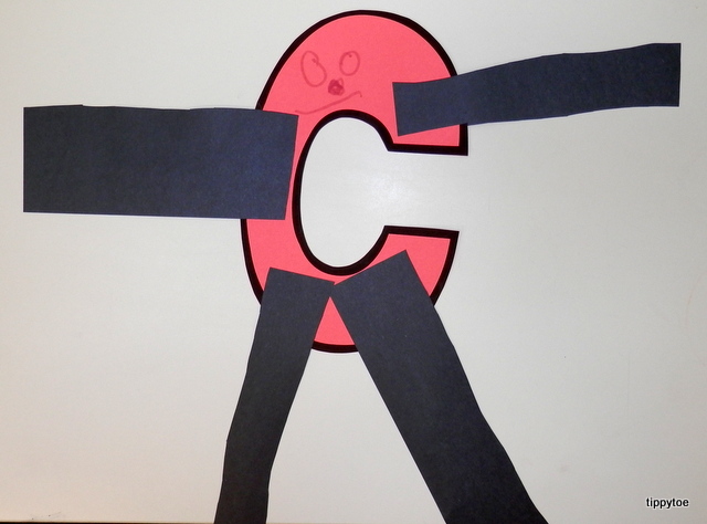 We are reviewing our letters and numbers this week. I printed out the first letter of each child's name in big block-letter form onto bright card stock.
