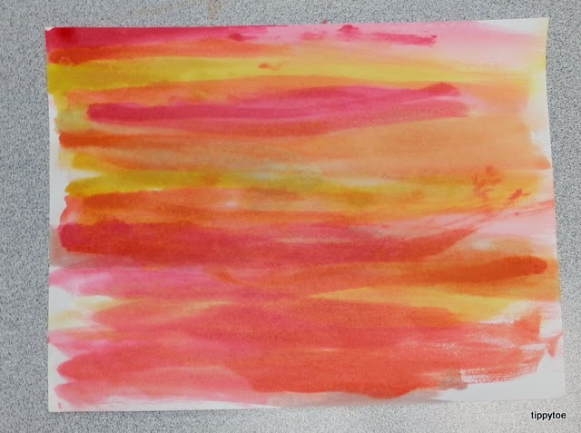 This is something the kids could do themselves, but I was helping them out. I also noticed when we used regular white construction paper, the colors didn't blend very well. The paint soaked in really fast. Maybe we should have painted with water first, then used the water colors.