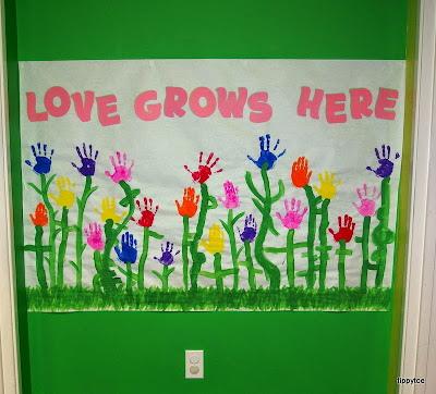 In the picture above, some of the stems hadn't been painted in yet. All the kids made their own stems except for the 2-year-olds, which were painted by one of my 4-year-olds or me. And the kids had to get a little creative with their stems because they had to avoid painting over someone's handprint! I wish I could have gotten prints from the infants and toddlers, but it would have been too tricky. If I had thought of it before I started, I would've done their prints first and made the white paper much bigger. But I still love how it turned out. I titled the display, "Love Grows Here" and hung it at the end of a long hallway.